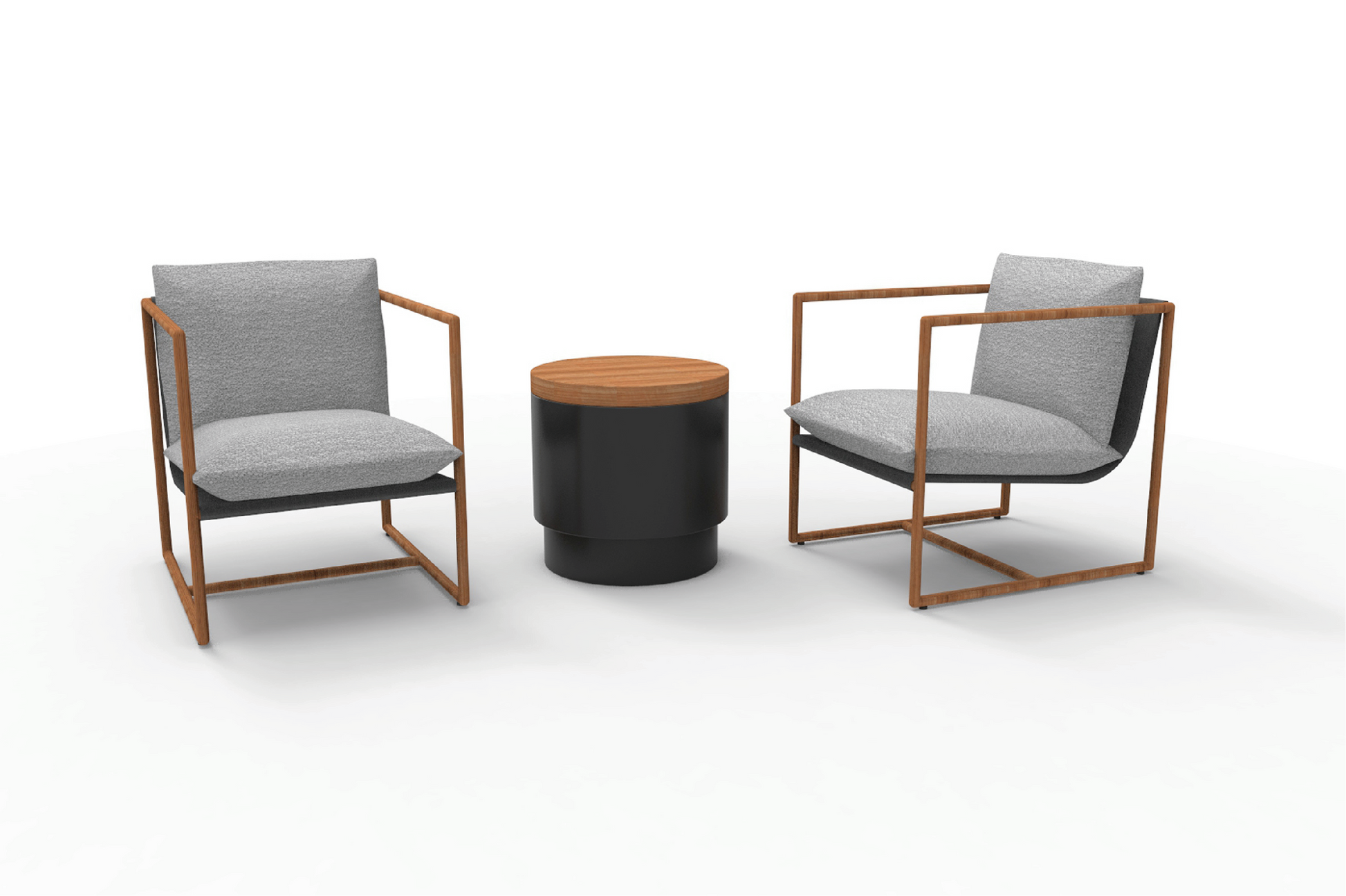 This set includes two sleek armchairs with gray cushions and black metal frames, accented with wooden armrests. A cylindrical side table with a ribbed texture and a wooden top complements the chairs, forming a cohesive three-piece set for a small space.