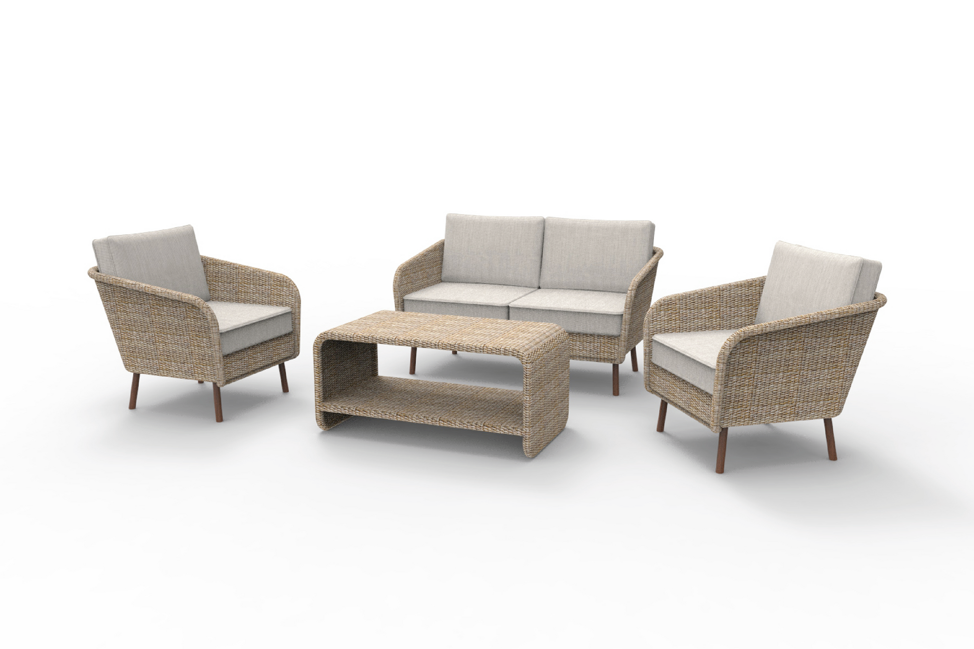 This set boast a woven wicker design in a natural hue. The armchairs and love seat are complemented by liight-gray cushions, providing an inviting seating experience. The coffee table is designed with functionality in mind, featuring a lower shelf for additional storage.