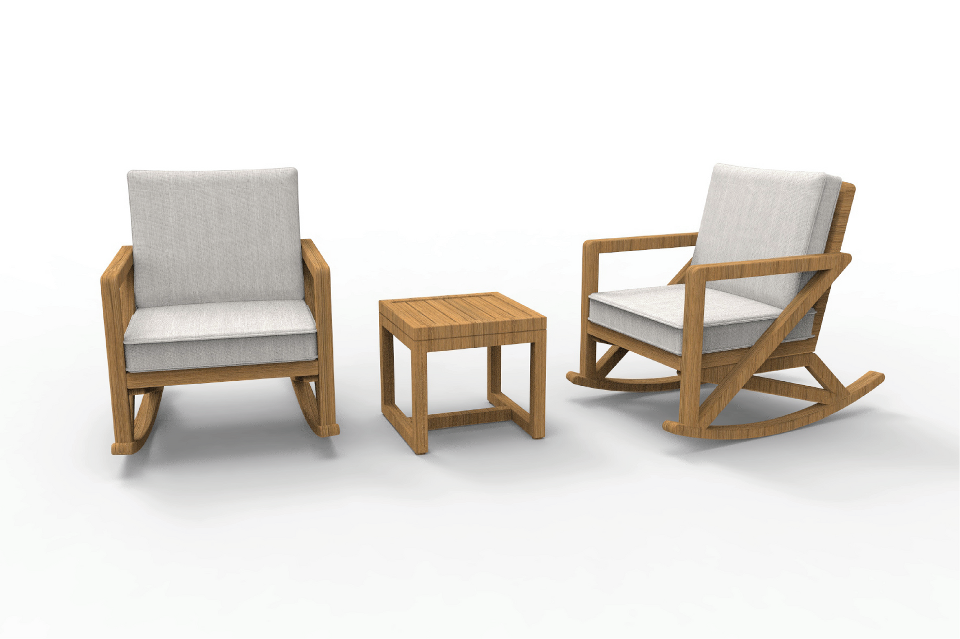 This set includes two rocking chairs with back and seat cushions, and a square side table, all in a natural wood transfer print finish. The light gray cushions offer a contrast that accentuates the warm tones of the wood and provides a welcoming, comfortable seating experience.