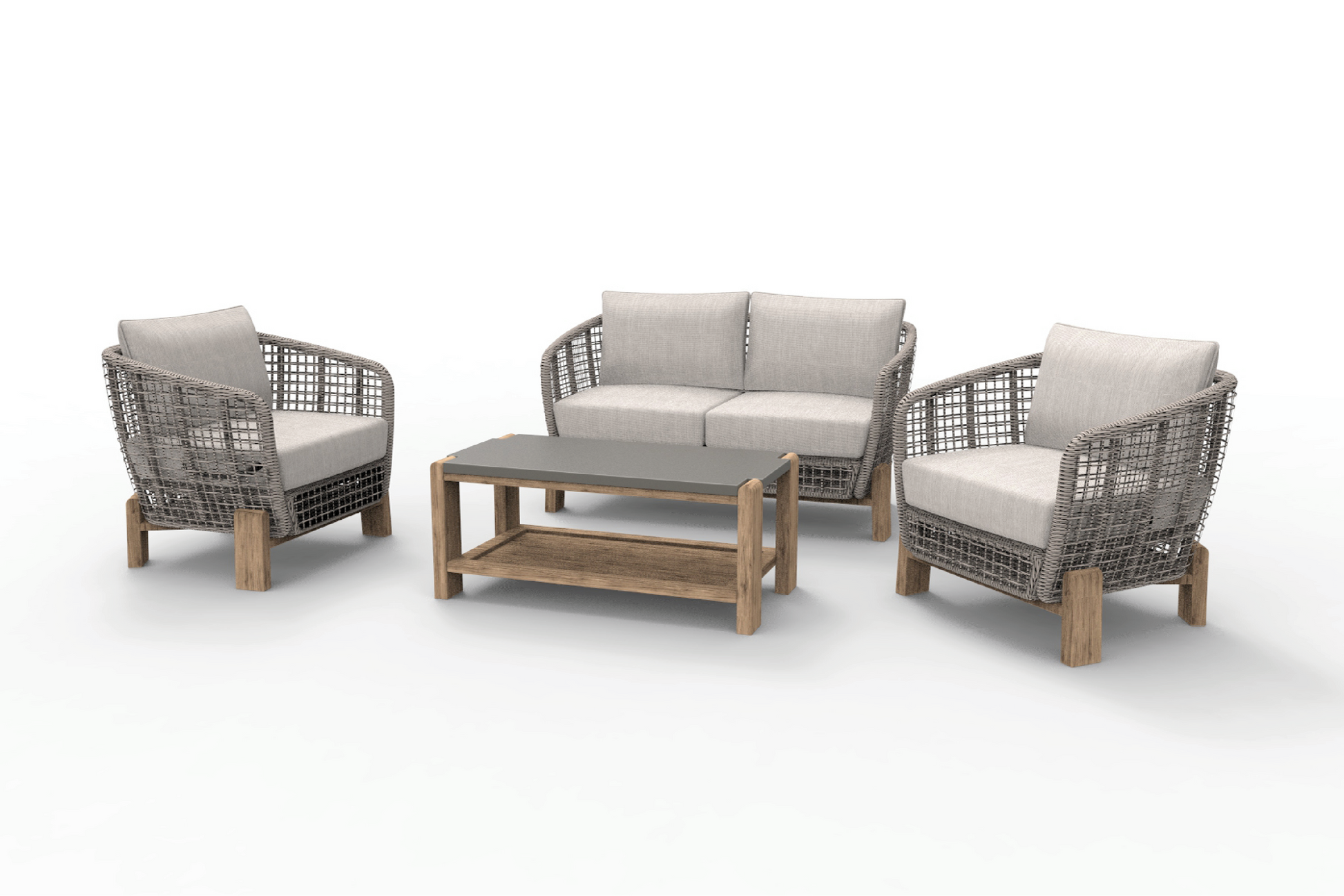 Revel in the rustic charm of our artisanal patio set, a perfect amalgamation of traditional craftsmanship and contemporary design. This set includes two armchairs, a loveseat, and a coffee table, each piece harmonizing wood and wicker elements. The chairs and loveseat feature a unique open-weave pattern on the sides, rendered in a greyish tone that mimics the patina of driftwood. The cushions, in a complementary light grey, promise both resilience to the elements and a soft, inviting seat. The coffee table features a grey tabletop that mirrors the set's aesthetic, complete with a lower shelf for additional storage.