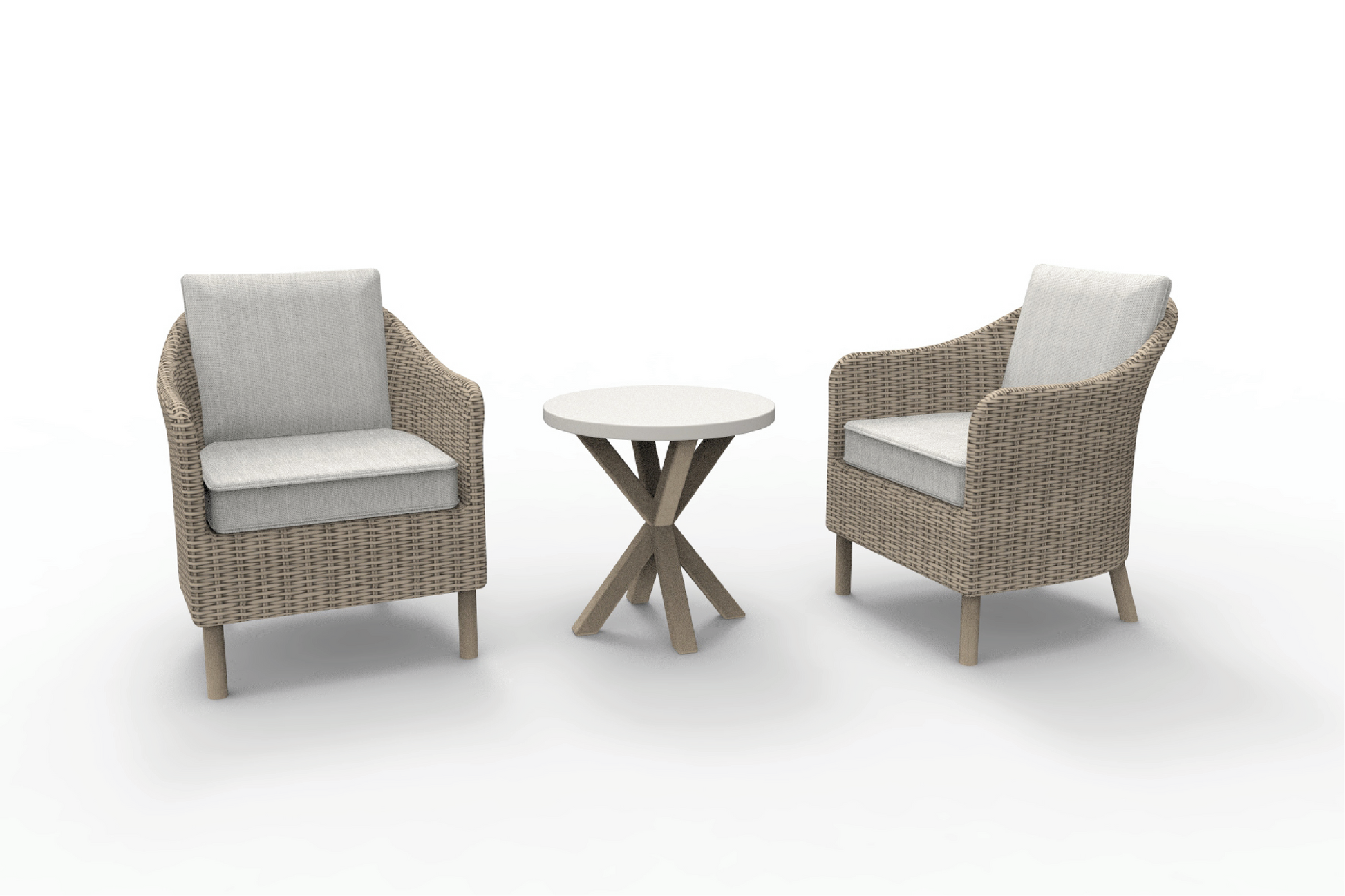 The Brolly set consists of two woven armchairs in a neutral tone, accented with warm terracotta cushions. The round transfer print table stands out with its striking X-shaped wooden base, providing a unique design element.