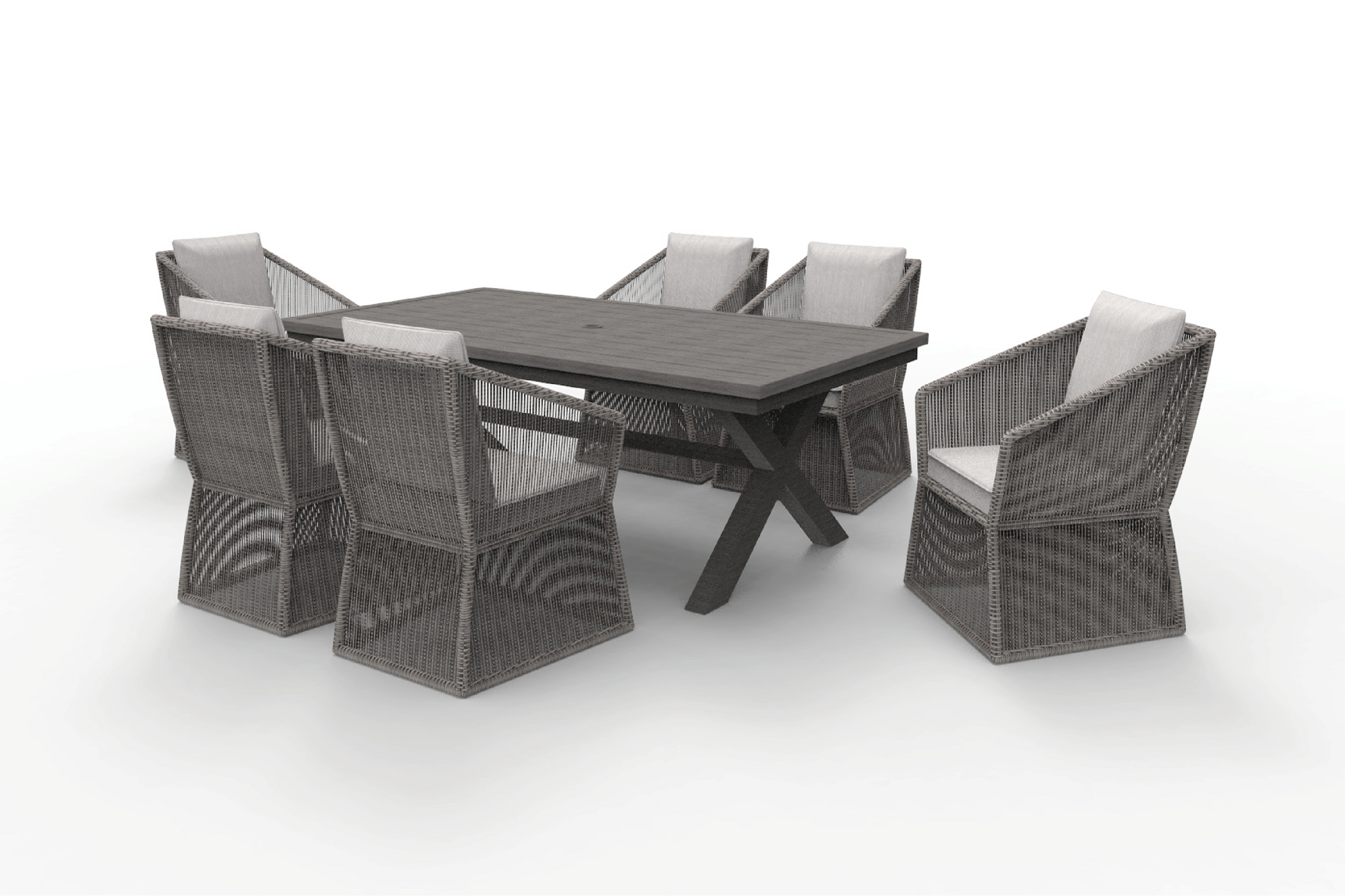 This dining set presents a striking combination of dark-toned, angular table and intricately woven chairs, offering a modern twist on traditional outdoor furniture. The chairs feature a distinctive pattern in the weave and a dark slatted table top.