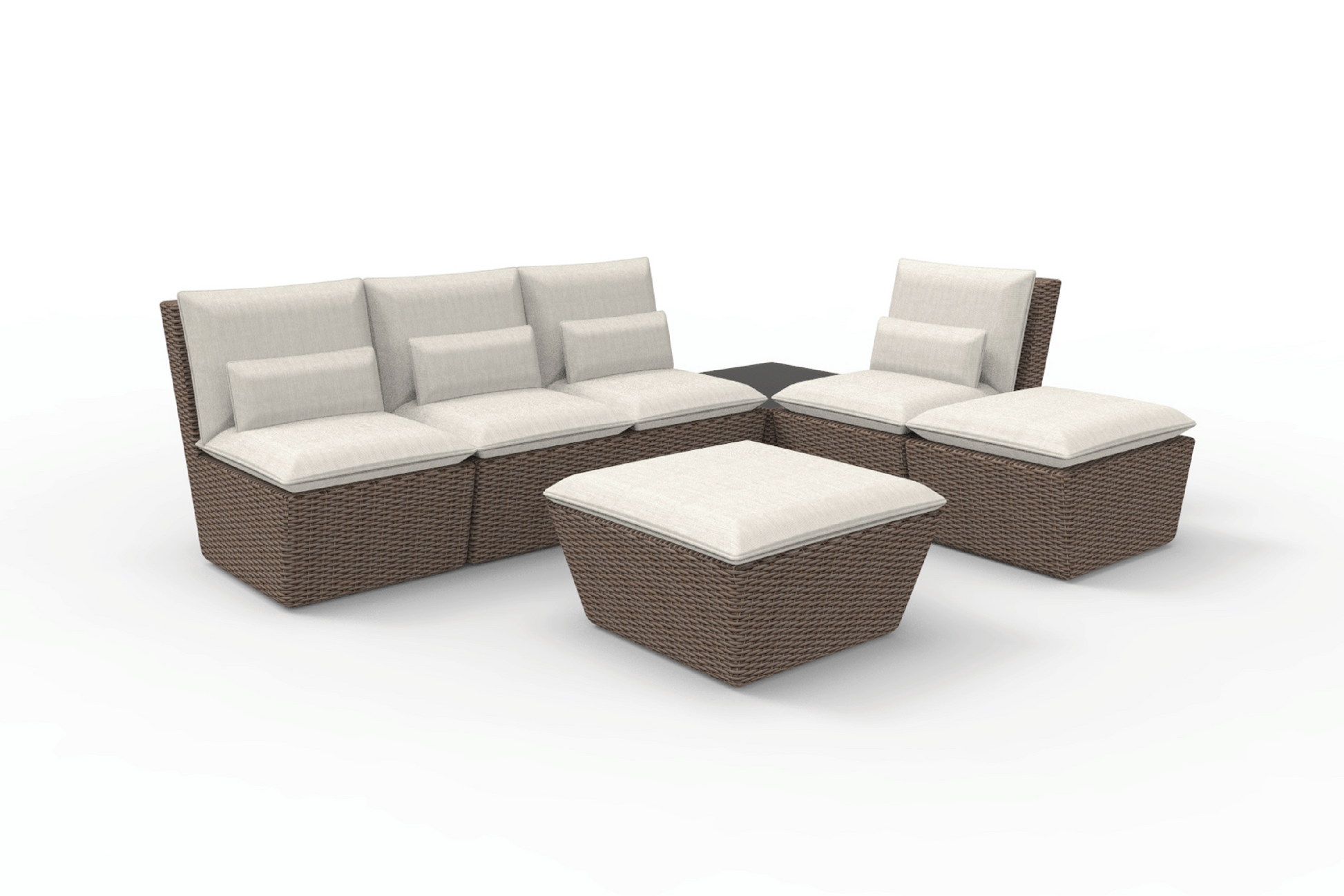 This ensemble features a three-seater sofa with clean lines and deep, plush cushions in a serene cream tone that exudes elegance and invites extended lounging sessions. The robust, brown wicker framework is designed to withstand the elements while maintaining a timeless aesthetic. Accompanying the sofa are two generously sized ottomans, doubling as additional seating or as footrests, and a square coffee table with a cushioned top, offering flexibility in usage.