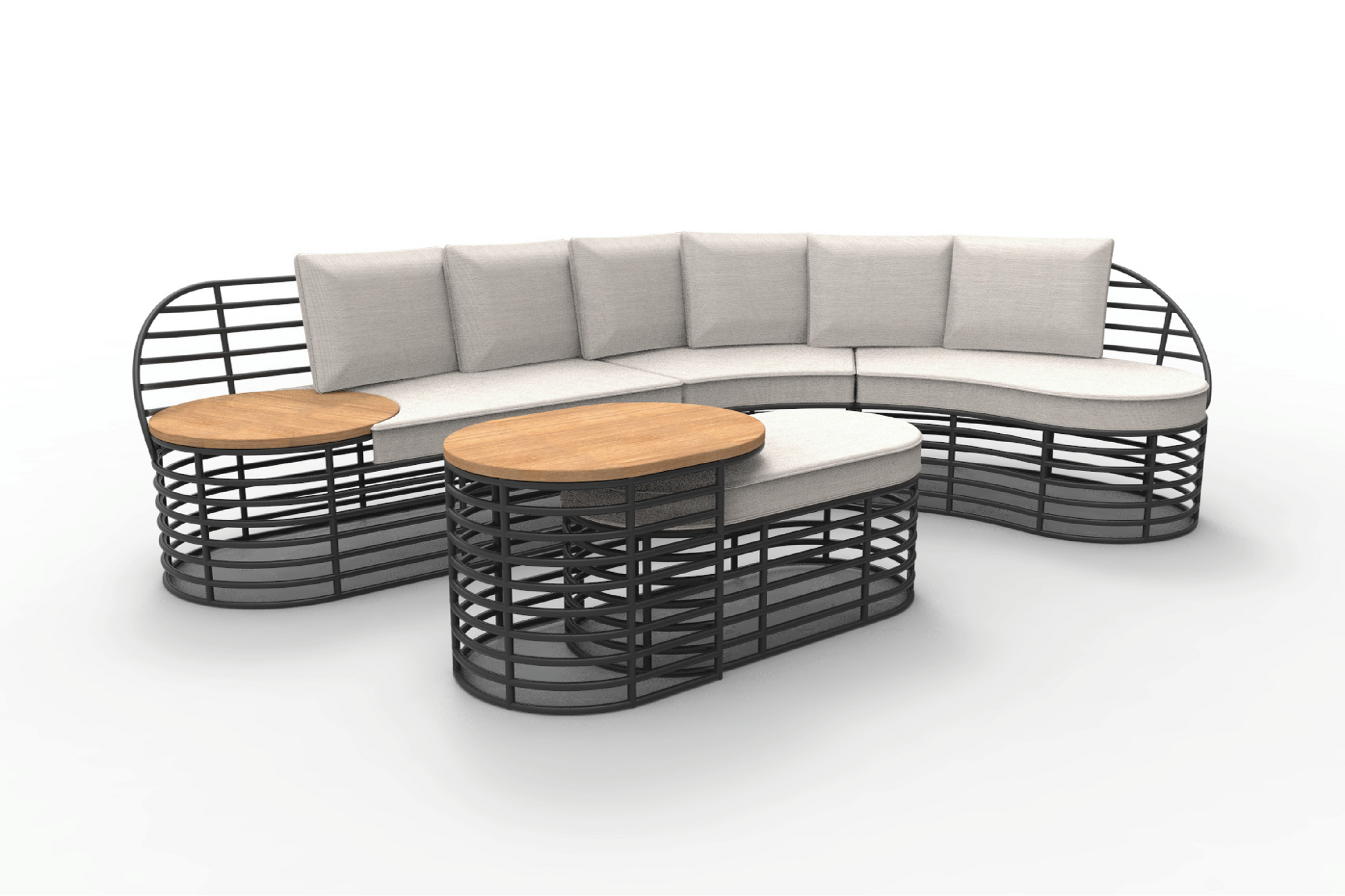 This set present a striking design with its curved, black metal frame. The circular patterning of the metalwork adds an artistic flair, reminiscent of modernist styles. The centerpiece features a teak wood transfer print top and nesting ottoman.