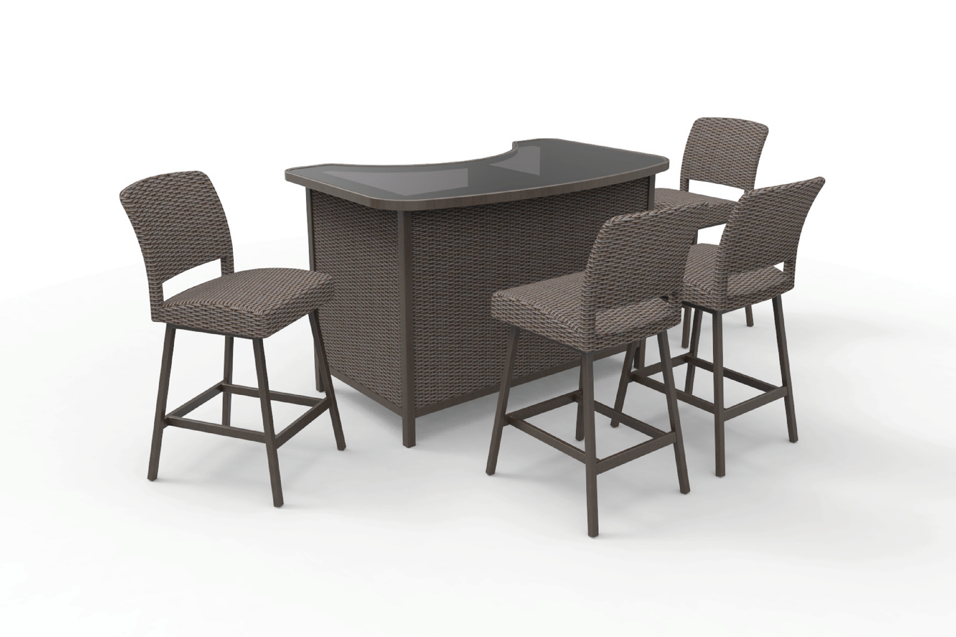 Elevate your outdoor entertaining with our sleek patio bar set, a symbol of sophistication and contemporary design. This set features a stylish bar with a smoothly curved countertop finished in a chic glass top that complements the rich texture of the woven wicker body. Accompanied by four high bar chairs, each piece is crafted with a harmonious blend of wicker and a robust metal frame, offering both comfort and a touch of modern elegance. The chairs are designed with ergonomics in mind, providing a supportive backrest and footrest for a relaxed seating experience.