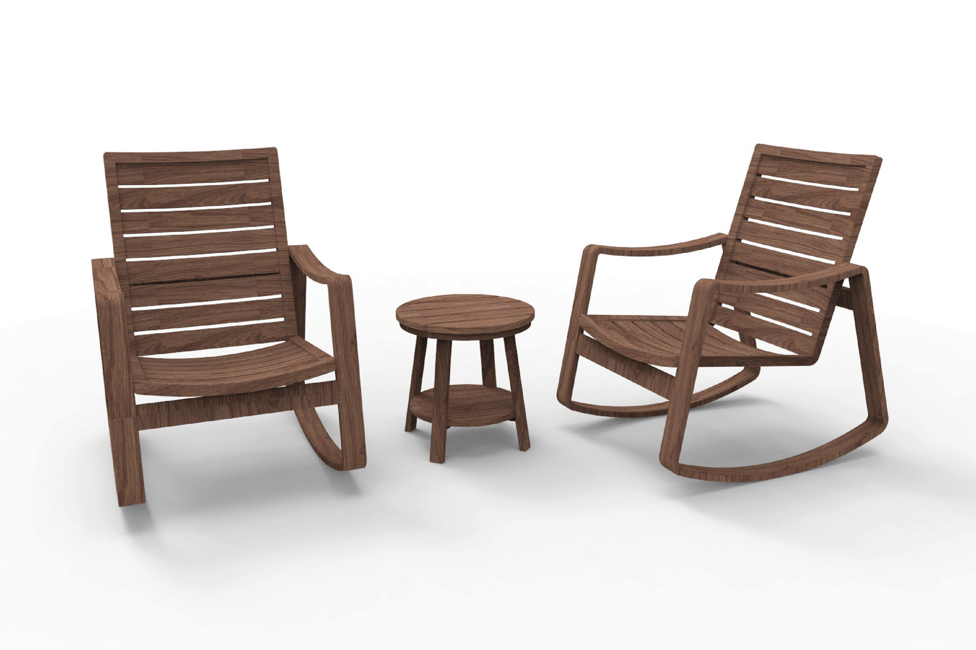 This set includes two rocking chairs and a small round table featuring a rich brown wood transfer print. The chairs feature a slatted back and seat design with curved armrests, which complements the smooth, rounded edges of the table.