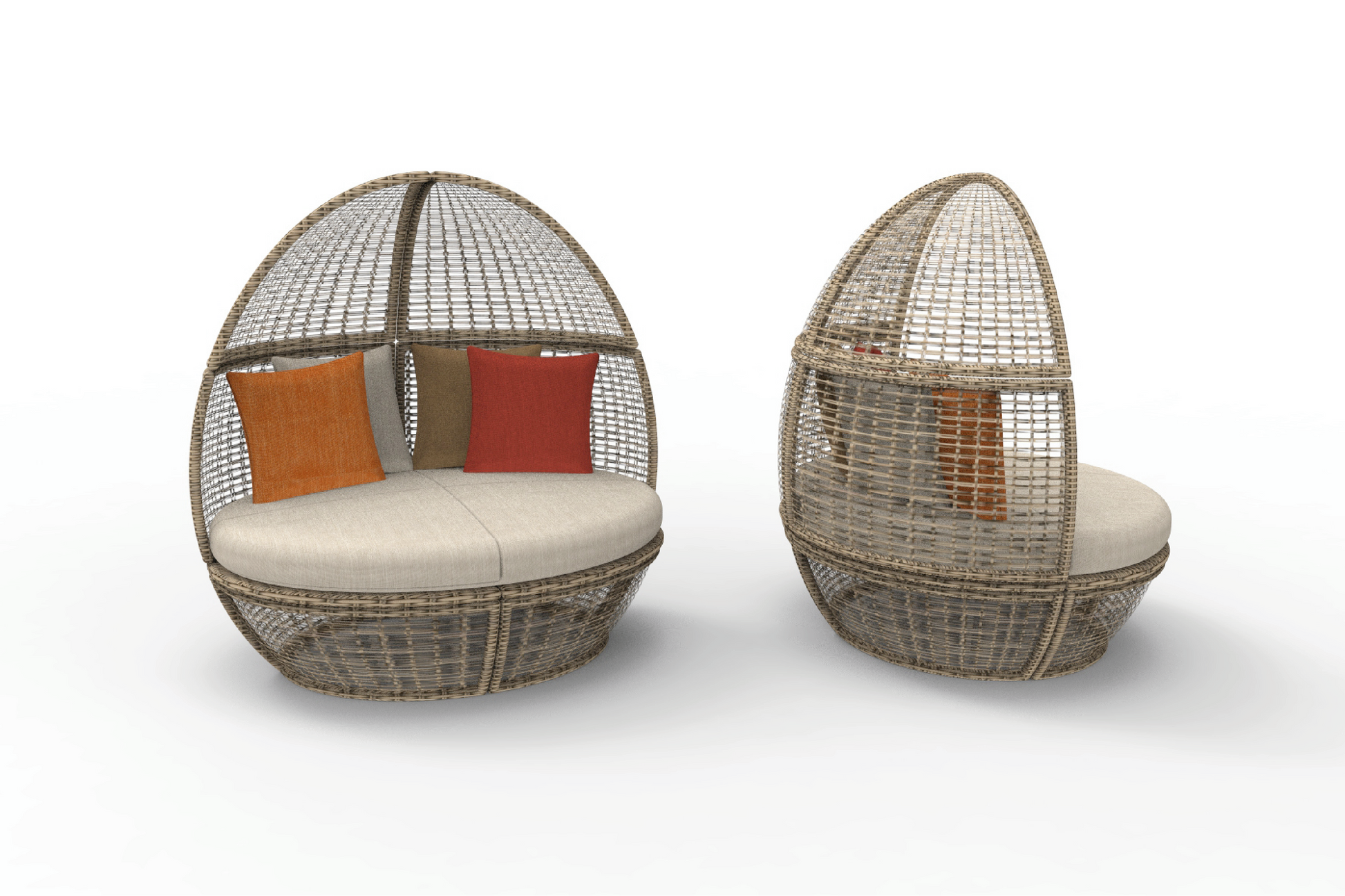 The Lonsdale chair is an egg-shaped wicker lounge chair, featuring a fine mesh design for a semi-transparent look and sturdy support. The chairs, possibly include comfortable, round base cushions and smaller accent pillows in neutral and warm tones.