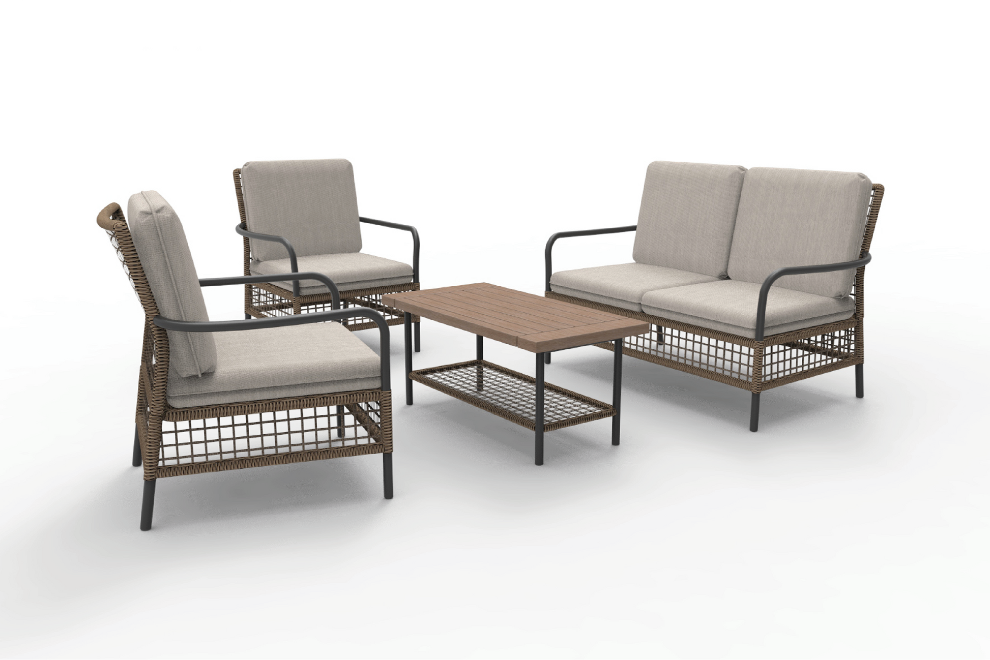 This set features a sleek metal frame in dark tones, accented with wicker side panels. The coffee table echoes the design with a metal frame and a wicker lower shelf, topped with multi-step wooden slats for a contemporary and functional finish.