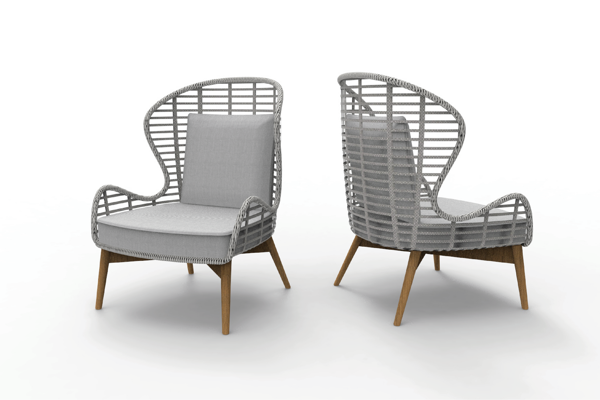 Introducing our stunning patio chairs, a masterpiece of craftsmanship that combines airy design with robust support. These chairs showcase an elegant, high-back silhouette with an open lattice weave made from premium, weather-resistant material, creating a look that is both intricate and airy. Each chair is complemented by a comfortable, light gray cushion that enhances the seating experience while maintaining a sleek, unified appearance. These chairs are not just seating options but statement pieces that add an artistic flair to any outdoor setting.