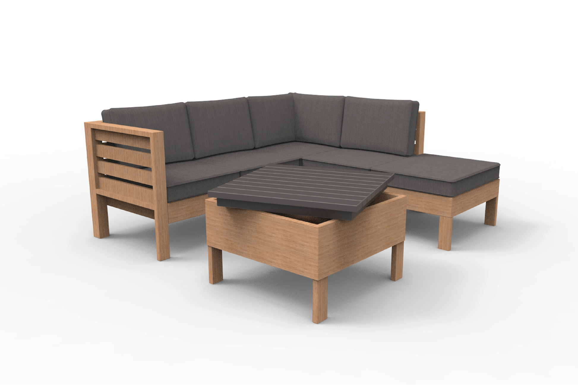 This set features a robust wooden transfer print frame that provides a solid foundation for the deep charcoal cushions. The centerpiece is a table with a contrasting dark top, perhaps metal, that doubles as a storage unit, ensuring functionality and style go hand-in-hand.
