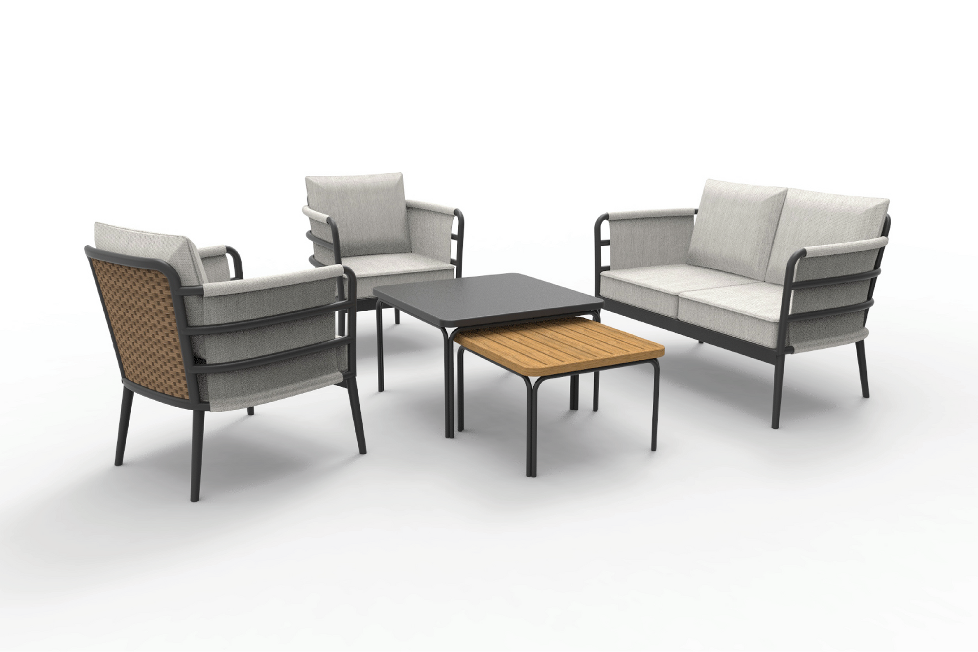 This set features a modern design with sleek black metal frames and wicker accents creating an elegant, two-toned aesthetic. The larger coffee table is minimalist with a slatted black top, while the smaller table adds a natural element with a wooden transfer print top.
