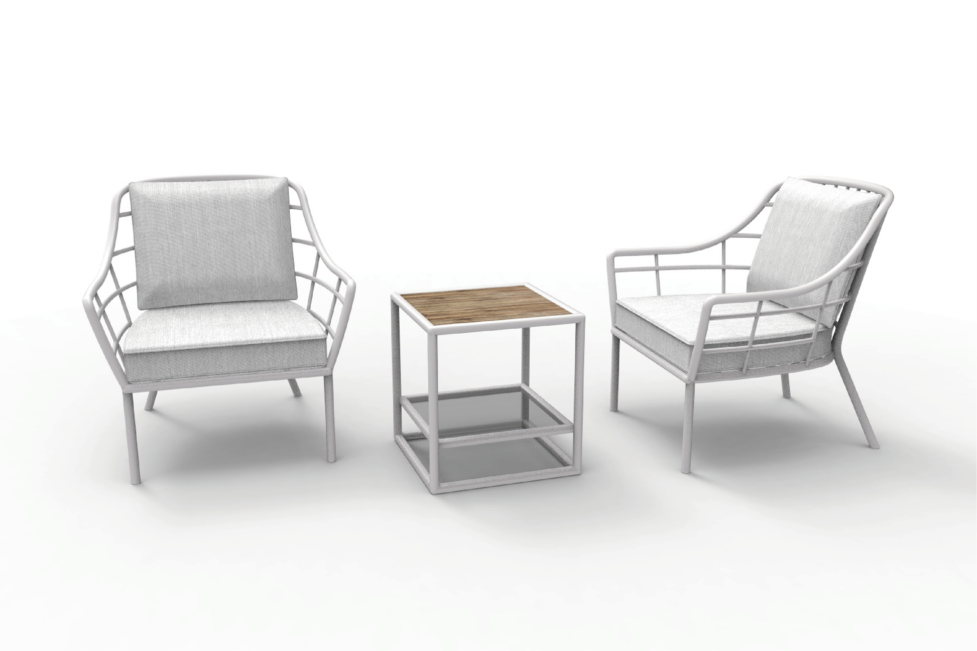 This set features two metal armchairs with geometric frames and light gray cushions. The square side table echoes this modernity, combining a white metal frame with a contrasting wooden transfer print top, offering both visual interest and functional space.
