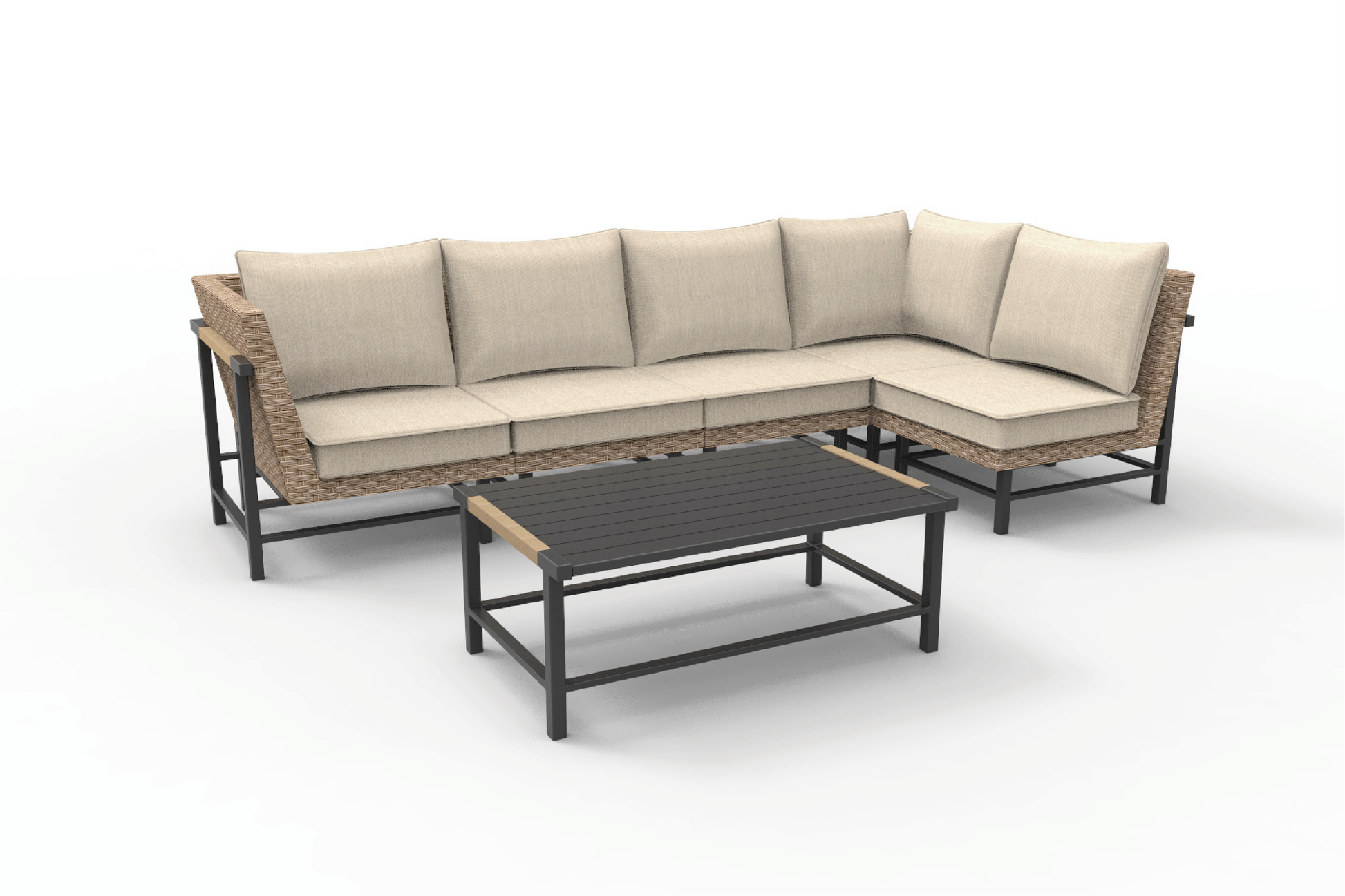 This collection boasts an L-shaped sectional sofa, seamlessly blending natural tones with industrial accents. The sofa is supported by a sturdy black metal frame, paired with a unique handwoven tan wicker along the sides, culminating in an organic yet contemporary look. Complementing the sectional is a matching coffee table, featuring a robust black metal frame and a slatted wood-like tabletop that combines durability with a refined aesthetic. This patio set is designed not only to be a focal point for your garden or deck but also to create a serene retreat for lounging and entertaining.